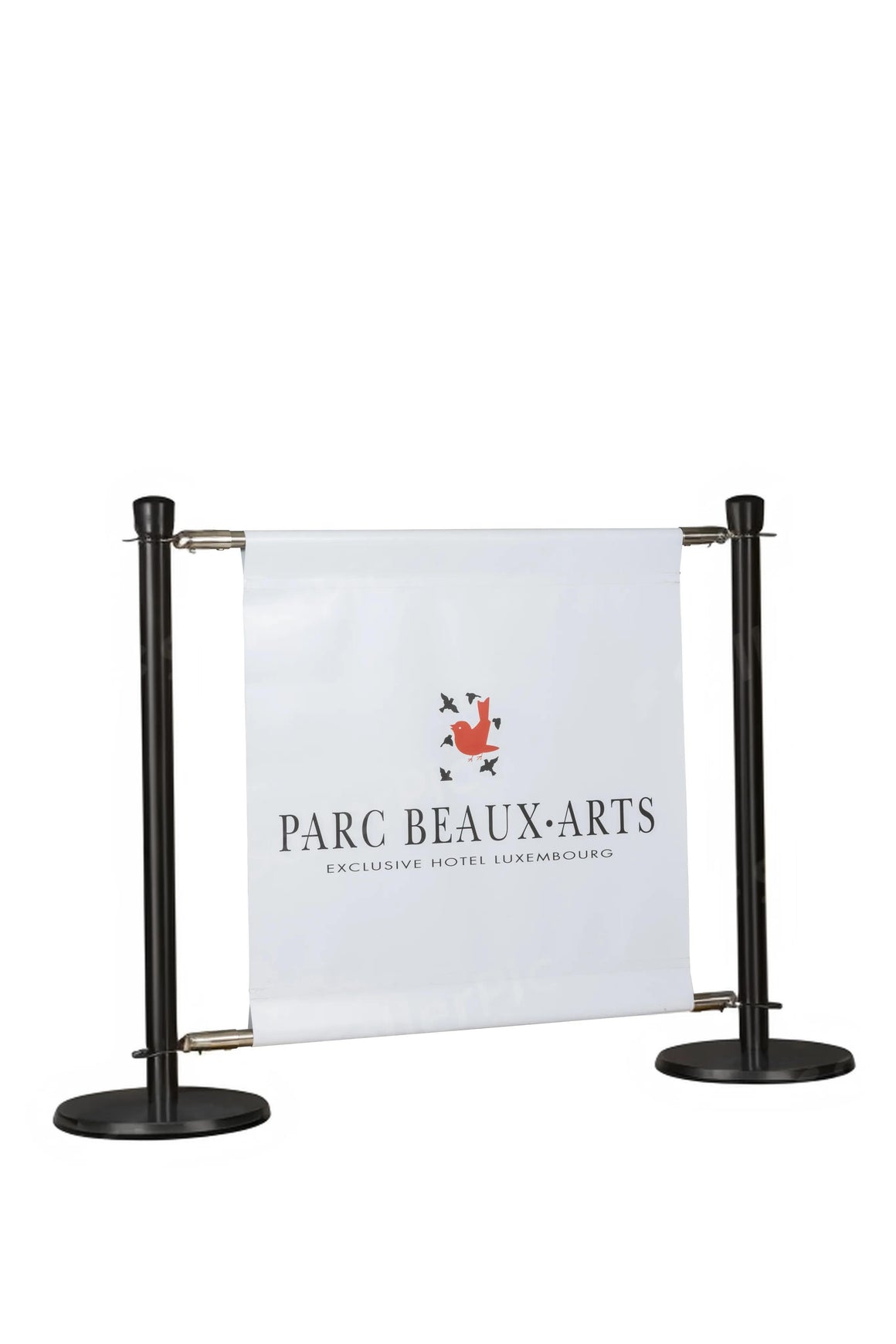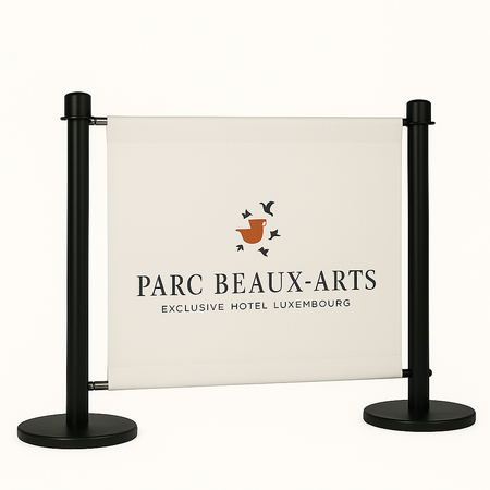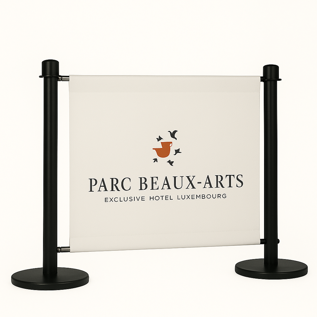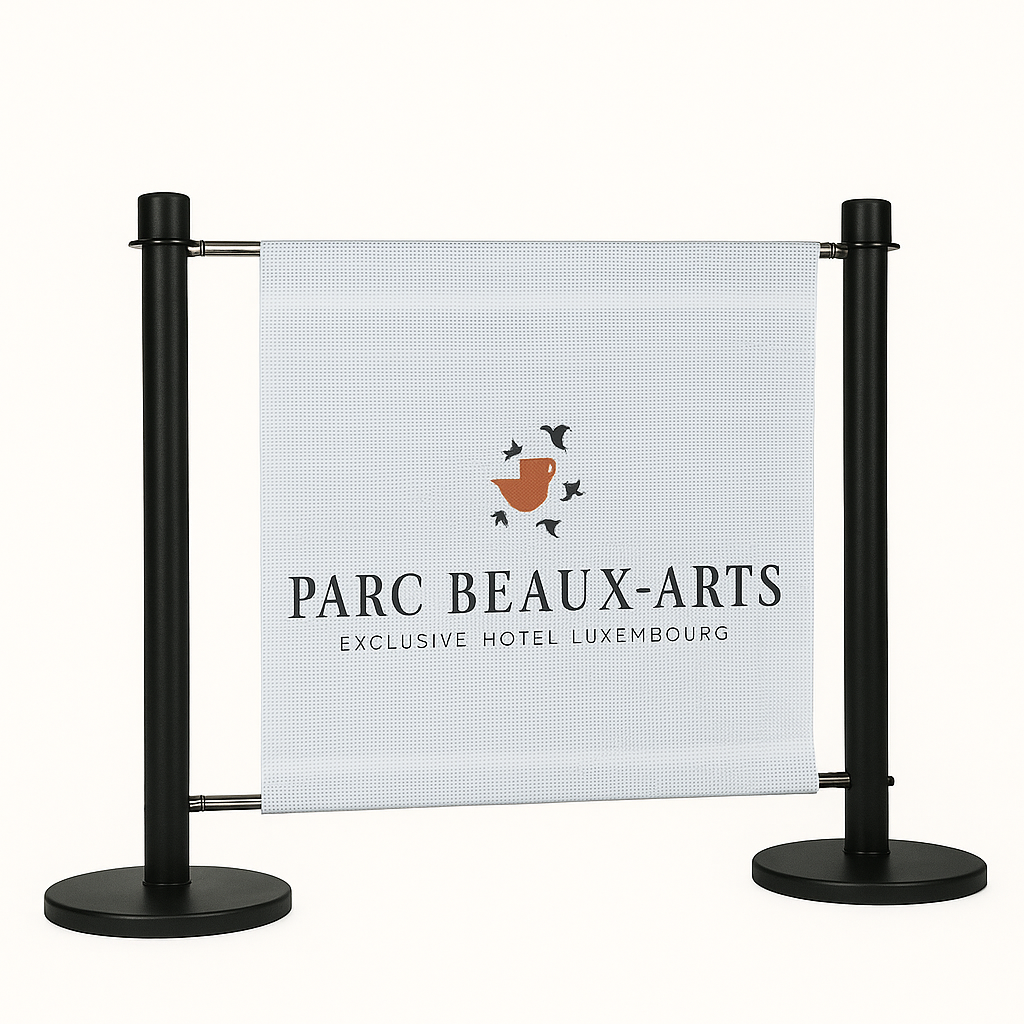 Présentez votre marque avec style grâce au Flexibarrier Café Barrier Set, maintenant avec une bannière imprimée sur mesure. Parfait pour les cafés, restaurants et événements qui souhaitent renforcer leur identité avec des couleurs, logos ou messages personnalisés.
