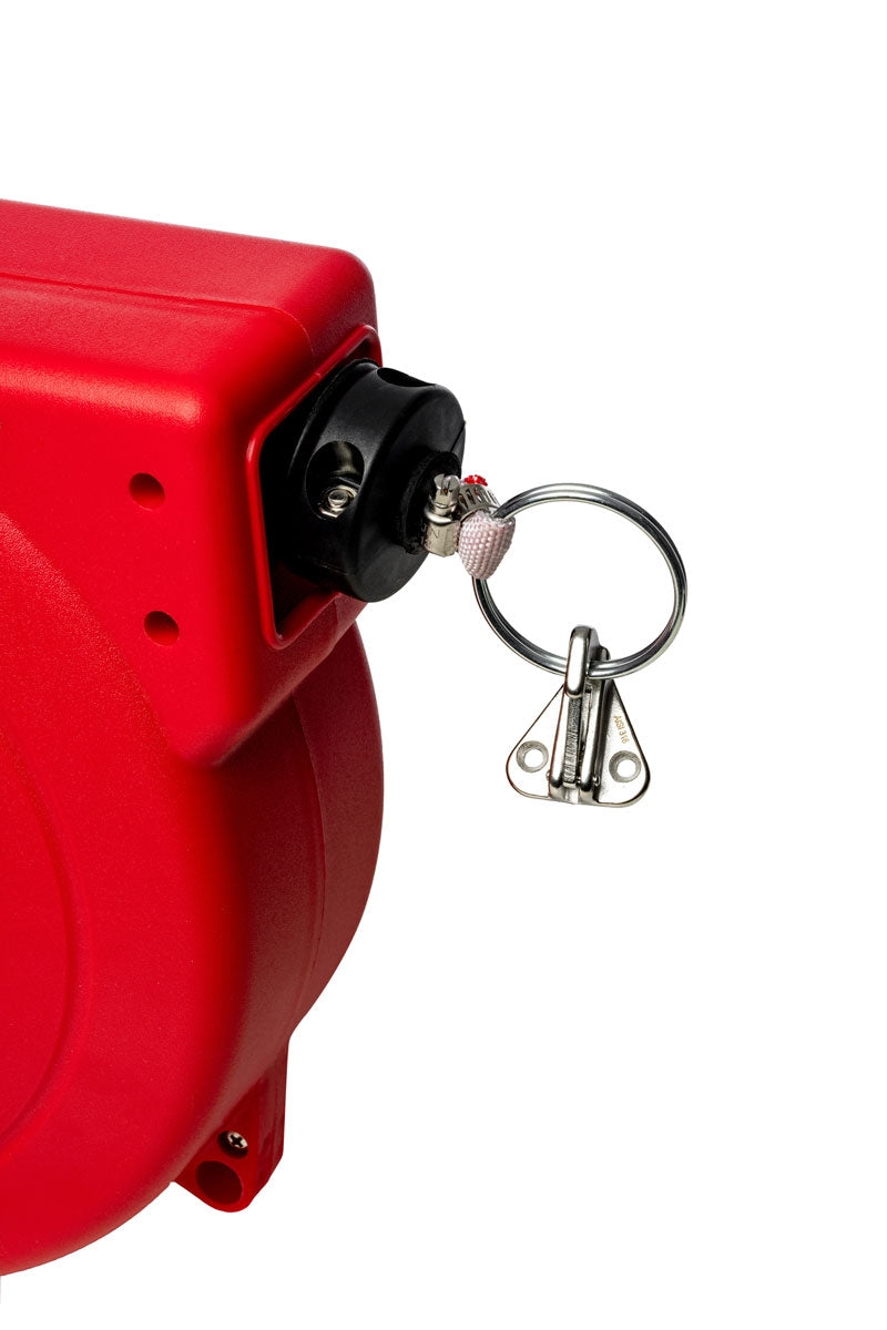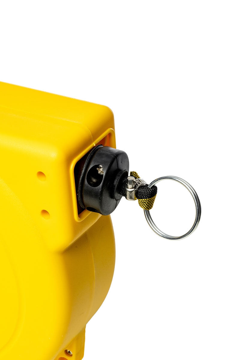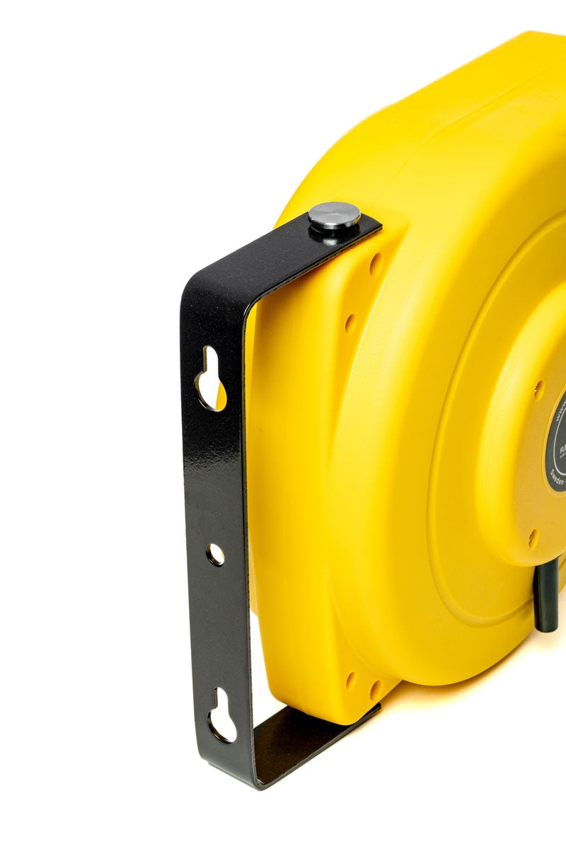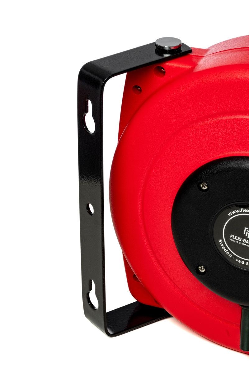 Montez simplement le dévidoir sur un mur et extrayez la sangle Noir-Jaune ou Rouge-Blanc - qui est sous tension constante - vers une autre surface et fixez-la à l'aide du réceptacle mural (inclus).