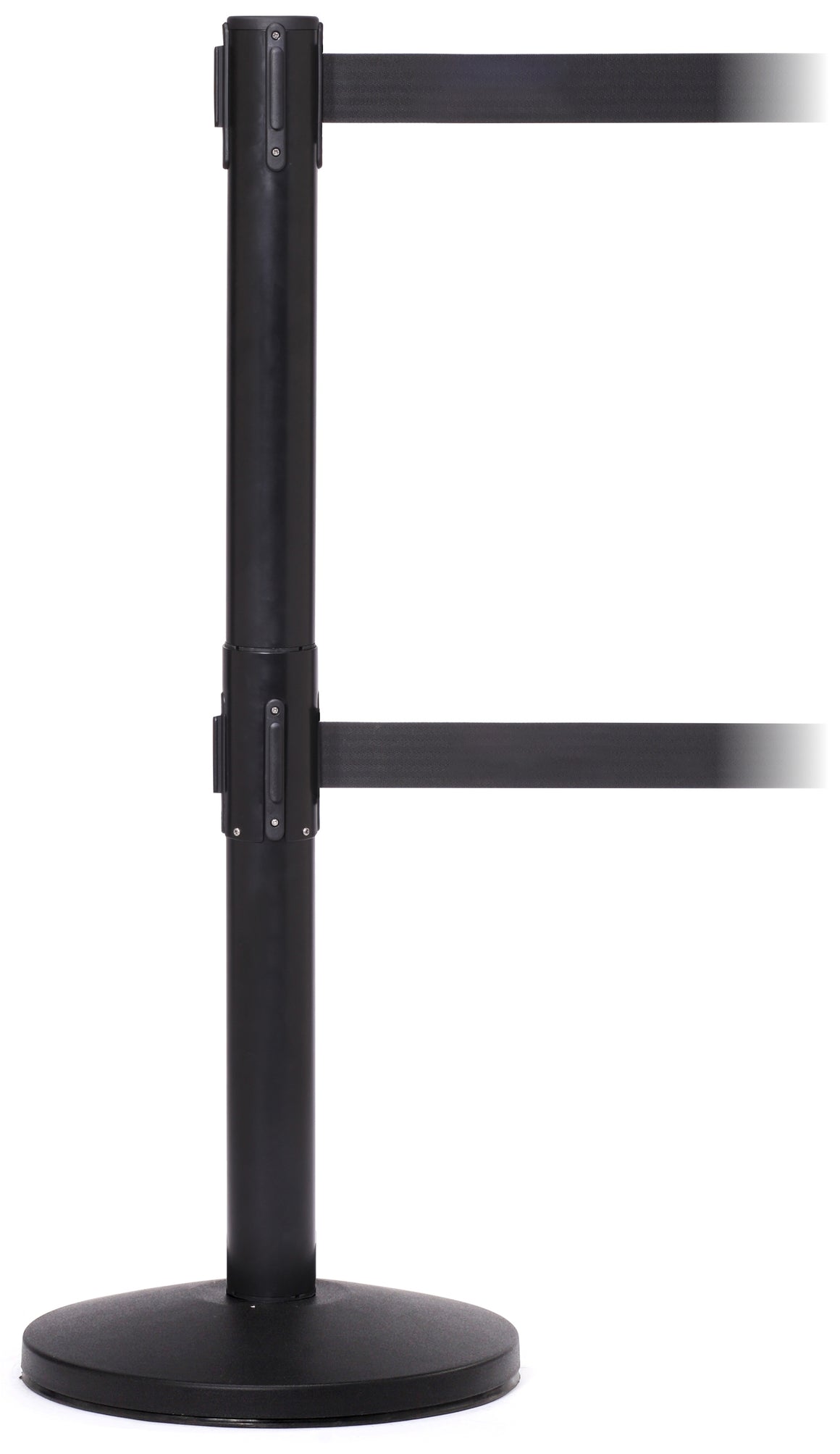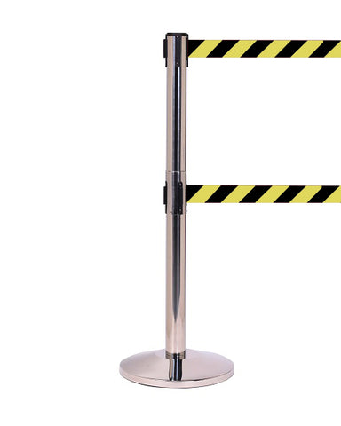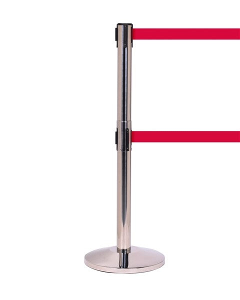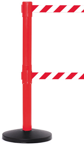Fabriquées selon les mêmes normes élevées que la barrière à ruban simple, ces unités ont l'avantage supplémentaire d'empêcher les gens de passer sous le ruban et d'empêcher les enfants de s'enfuir. La barrière rétractable à double ceinture est disponible en plus de 30 combinaisons différentes. La longueur du ruban est généreuse, avec 3 m. Cela signifie que vous avez besoin de moins de poteaux pour couvrir la même zone, ce qui signifie encore plus d'économies.