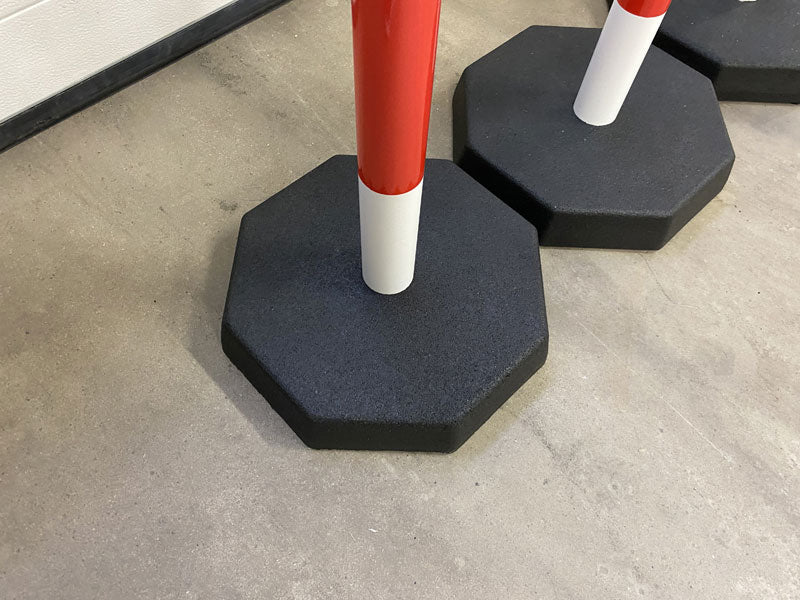 Poids du poteau : 9 kg (base 8 kilo) Hauteur : 900 mm Matériau : Plastique (Poteau : PVC, Base : PP) Base : Ø 390mm Chaîne PVC/Plastique Longueur : 25m