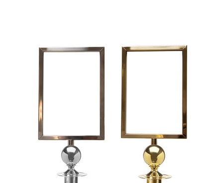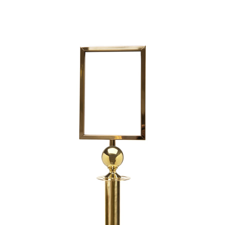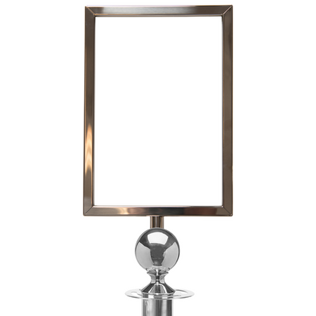Porte-affiche A4 élégant qui s'adapte au poteau de corde Flexibarrier -Basic Ball Top-. Disponible en chrome poli et laiton.