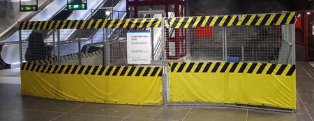 Couverture d'avertissement haute visibilité en jaune et noir, conçue pour s'adapter aux panneaux de clôture temporaire standard (2m x 3,5m). Idéale pour améliorer la sécurité et la visibilité sur les chantiers de construction et autres zones restreintes.